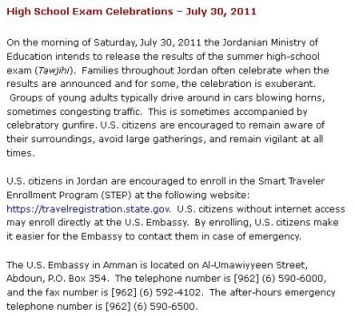 كما دعا الإعلان رعايا الولايات المتحدة في الأردن إلى الانتساب إلى برنامج المسافر الذكي عبر موقعه على الانترنت، مما يسهل على سفارة بلادهم الاتصال بهم في حال الطوارئ.