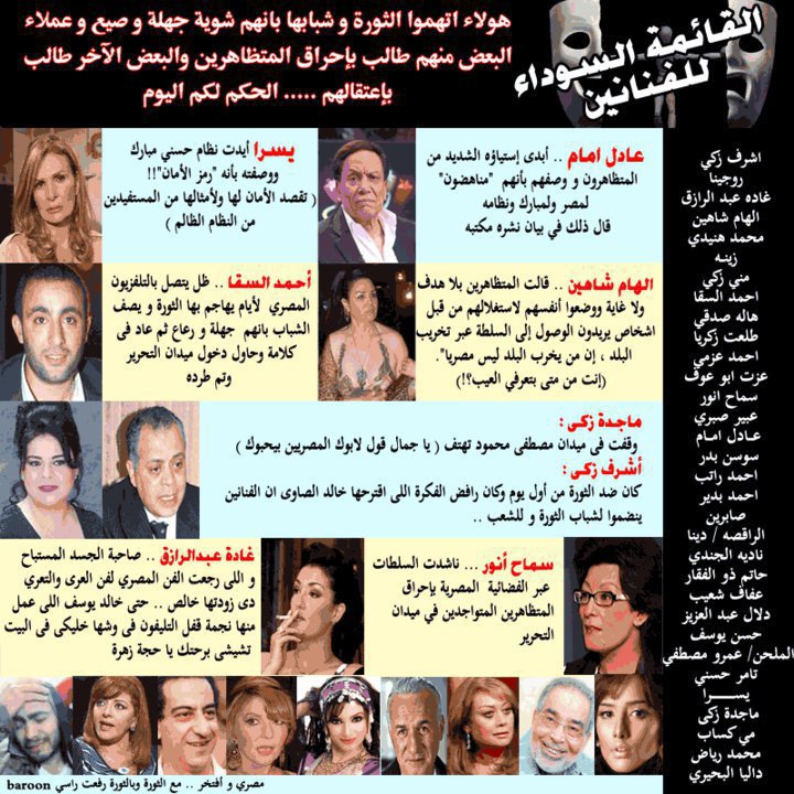 في مصر ظهرت "القوائم السوداء" خلال ثورة الخامس والعشرين من يناير/ كانون الثاني وهي قوائم وضعها نشطاء على مواقع التواصل الاجتماعي وتضم أسماء الفنانين الذين اتخذوا موقفا مناهضا للثورة وداعما للرئيس المصري السابق حسنى مبارك.ومع اقتراب موعد شهر رمضان المبارك، أصبح مستقبل نجوم "القوائم السوداء" على المحك، حيث نقلت وكالة أنباء الشرق الأوسط المصرية عن مجموعة من النقاد والصحافيين أن الوضع في التلفزيون يختلف عن السينما لأن الجمهور هو الذي يذهب إلى السينما ويدفع ثمن التذكرة وذلك بعكس مسلسلات التلفزيون التي تأتي إلى المنزل