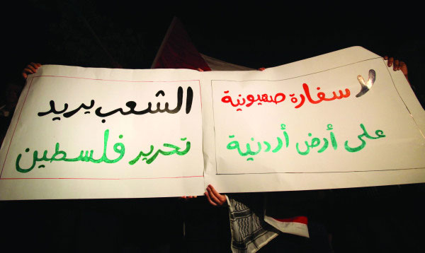 طالب مئات المعتصمين، في وقفة احتجاجية نفذوها عقب صلاة التراويح في باحة مسجد الكالوتي بالقرب من السفارة الإسرائيلية في عمان مساء السبت، طالبوا بطرد السفير الإسرائيلي من الأردن وإغلاق السفارة، تضامناً ودعماً للشعب الفلسطيني في غزة لما يتعرض له من غارات متجددة اسفرت حتى مساء الجمعة عن استشهاد 15 فلسطينياً بحسب - منظمات حقوقية - .