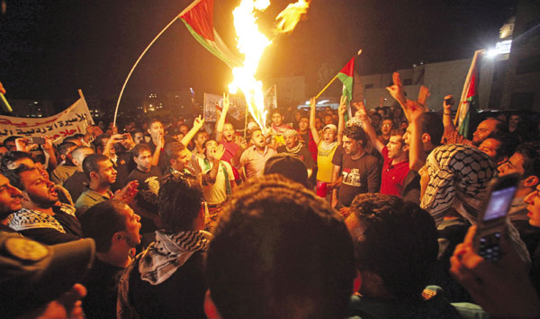 كما حرق المعتصمون العلم الاسرائيلي تنديدا بالاعمال الاجرامية التي ترتكيها اسرائيل بحق الشعب الفلسطيني وخاصة خلال الايام القليلة الماضية في قطاع غزة.